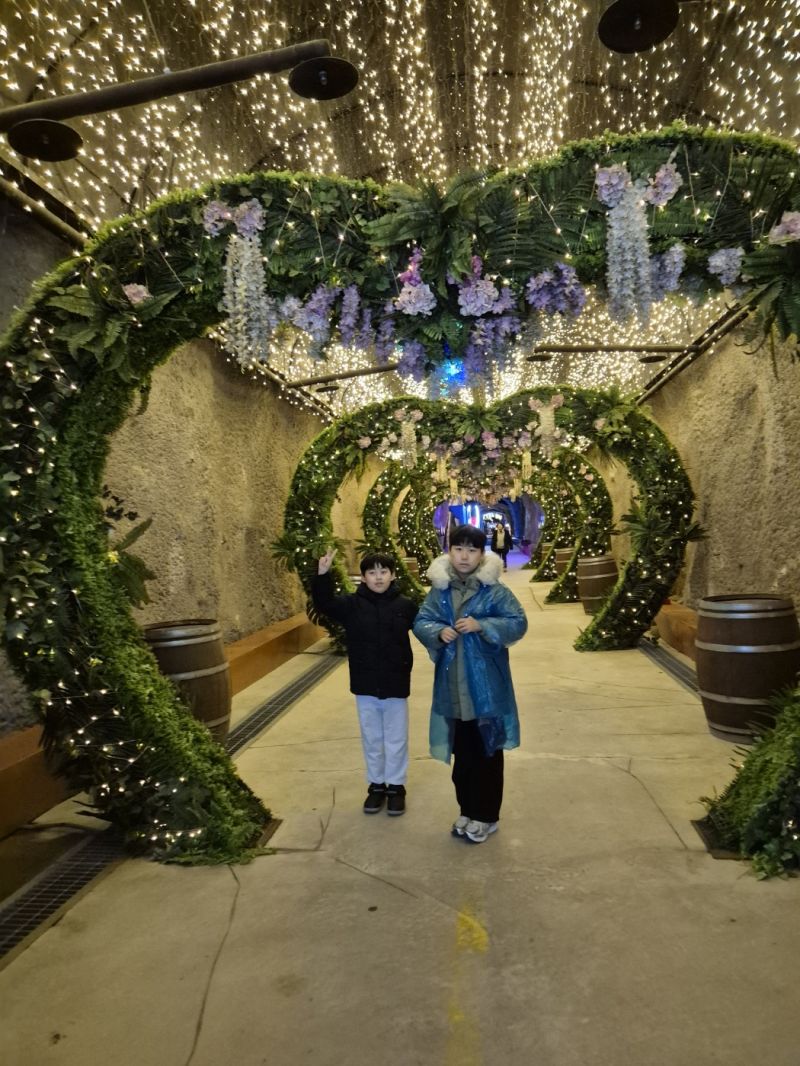 그냥 가기 아쉬워서 태권도원 공연도 보고 구경하러 가는 길에 카페 왔어요. 무심원이라는 곳인데 특이하더라구요. 컨셉이 낮과 밤인데 낮 10분, 밤 20분으로 암막 커튼이 자동으로 열고 닫힙니다. 낮인데도 밤같은 분위기가 나고 크리스마스 분위기 제대로 느꼈어요.