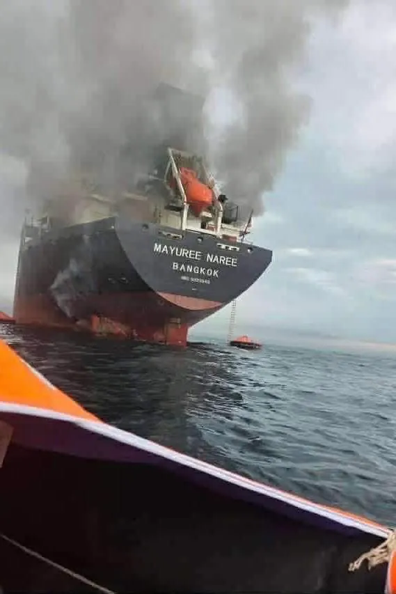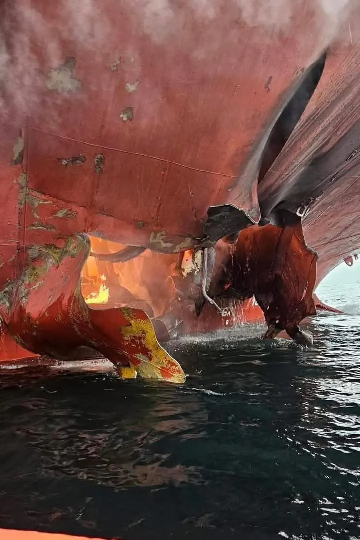 선박 뒷부분에서만 연기가 나는 점, 파손부위의 철판이 안에서 밖으로 밀려난걸 보니 상공이나 측면 방향에서 배를 들이받은 어떤 물체가 폭발하면서 그 폭압으로 아랫부분이 찢겨나간듯 합니다.