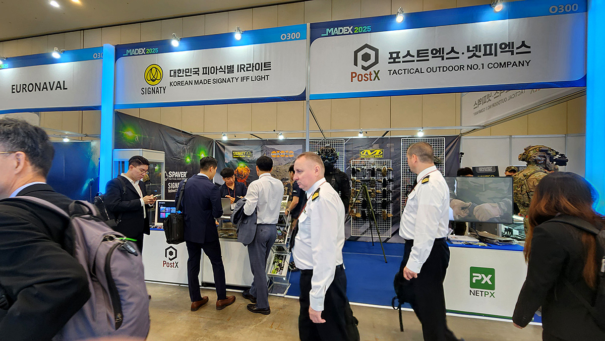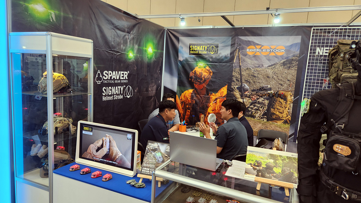 (주)포스트엑스는 자체 개발한 피아식별 IR 헬멧 라이트 ‘SIGNATY(시그나티)’를 메인 전시 품목으로 선보였습니다.