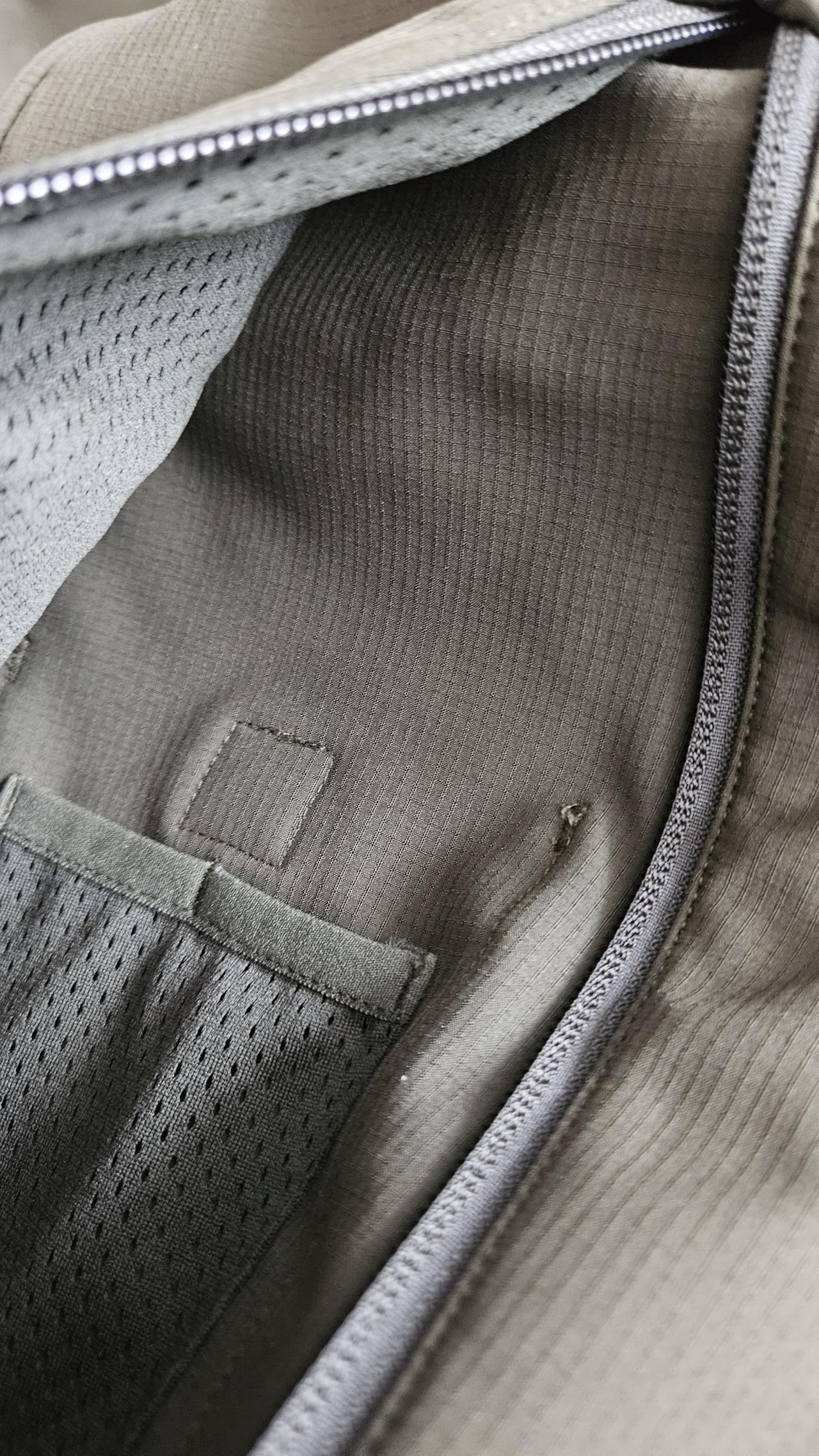 주머니 안쪽 이어폰줄 구멍이 없어지고 D형 고리도 사라졌습니다 내부꽂이도 매쉬로 바겼네요 목조여주는 줄도 사라졌습니다