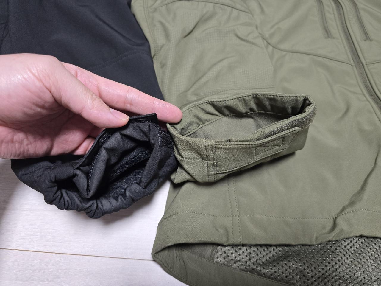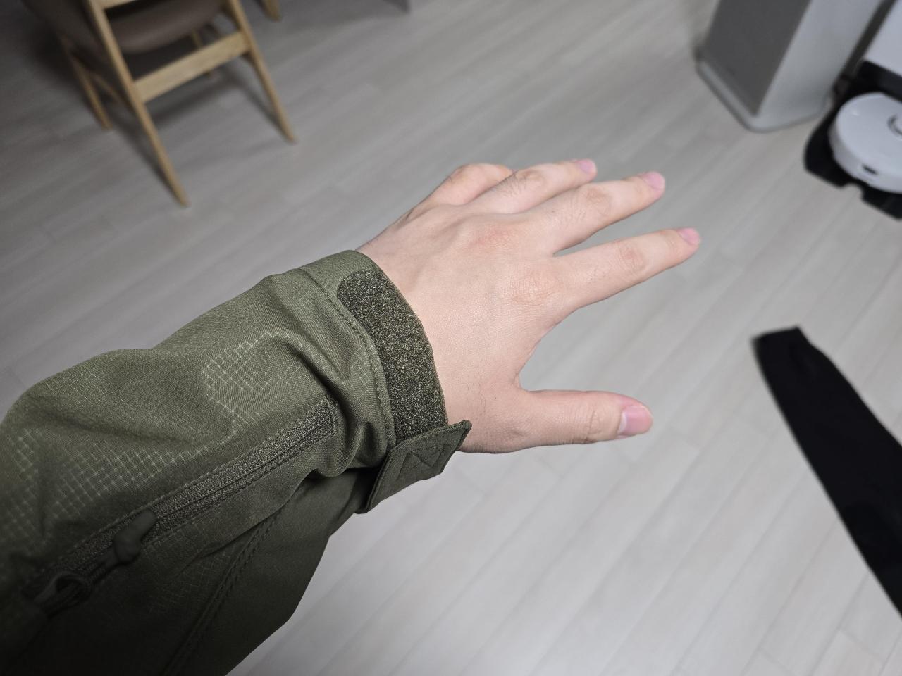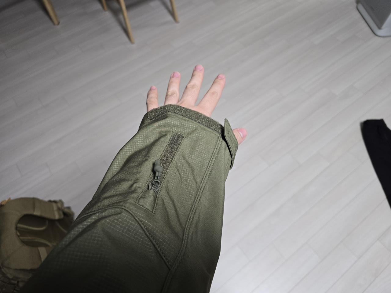 오른팔에는 팔쪽 벨크로쪽에 큰주머니(휴대폰 들어가는 사이즈) 가 있습니다.