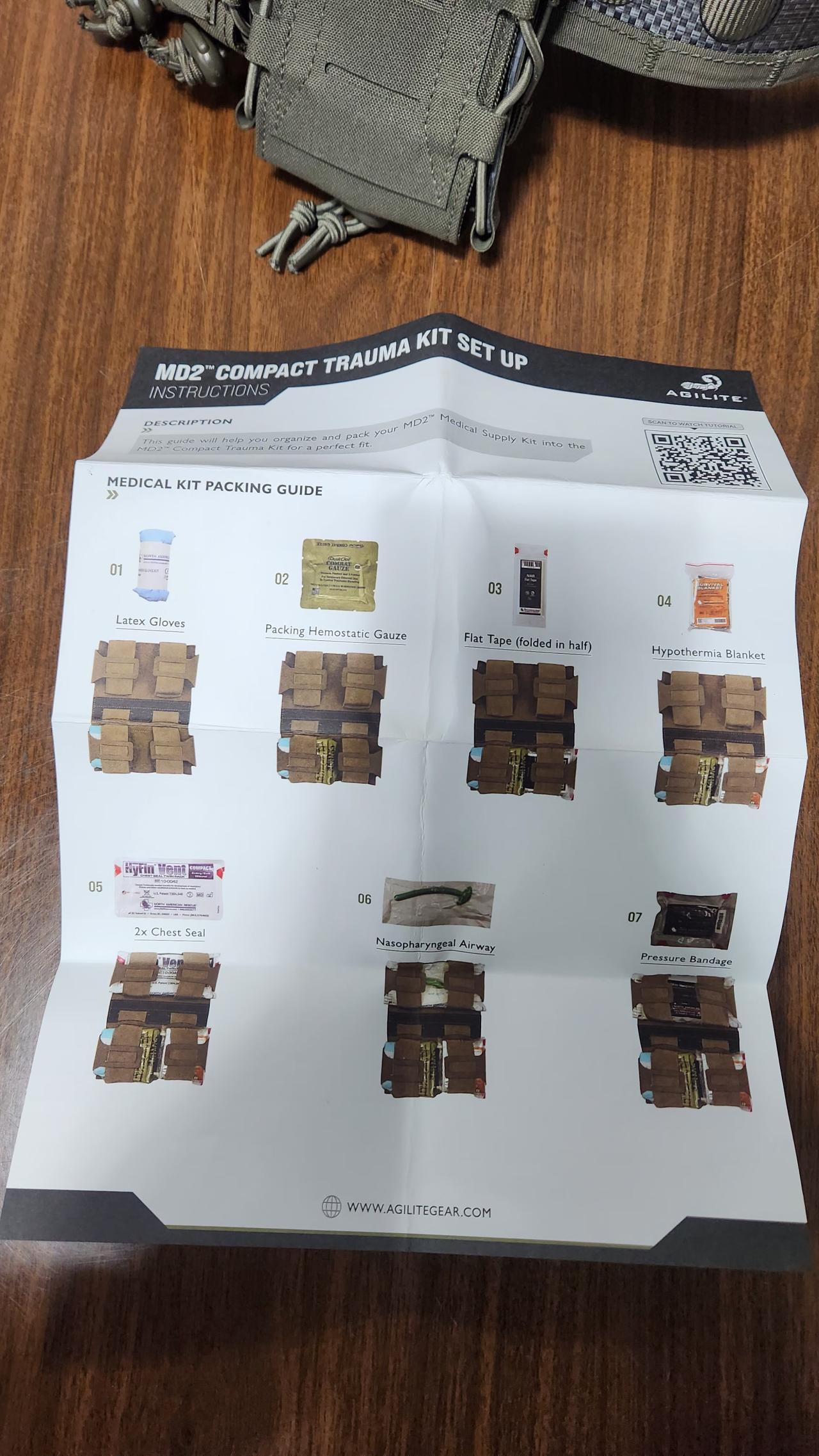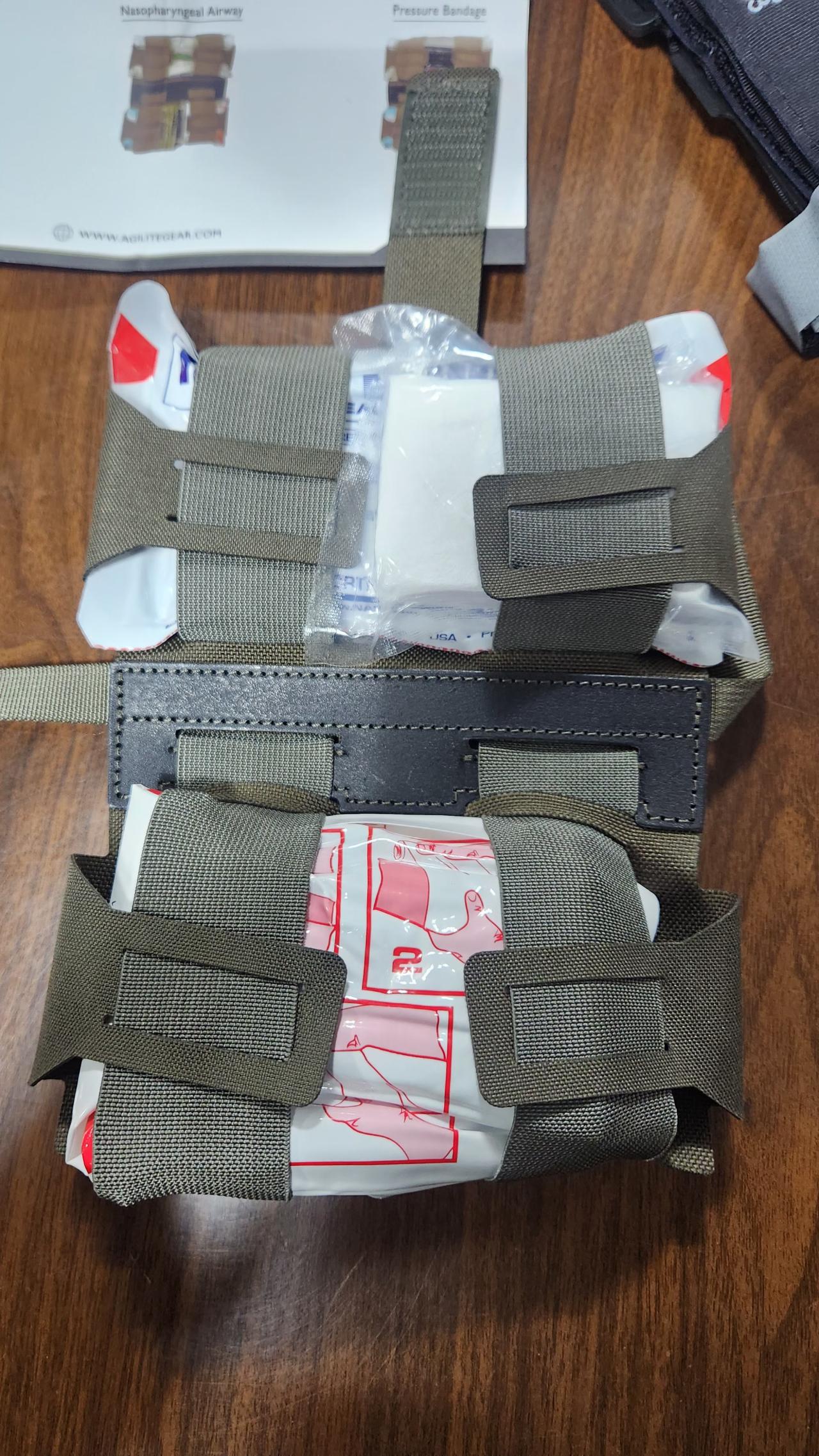 거즈, 라텍스 글러브, 압박붕대, 체스트씰, 코삽관형 기도확보기 등등 IFAK에 들어가는 내용물을 어떻게 수납하는지가 적혀있습니다.