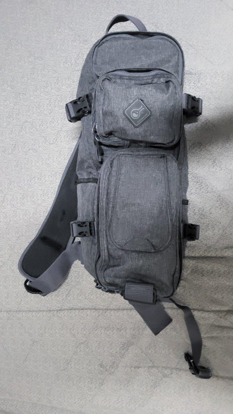 그레이 색상에 깔끔한 디자인으로 일상생활에서 사용하기 좋습니다. 어깨끈 패드도 두툼해서 착용감이 좋아요. 세로로 길고 폭이 좁지만 생각보다 많이 들어갑니다. 전면부 아래주머니에 사진과 같이 자잘한 물품을 보관할수 있는 공간도 있습니다. 일상속에서 독특한 디자인의 가방을 원하신다면 추천드립니다.