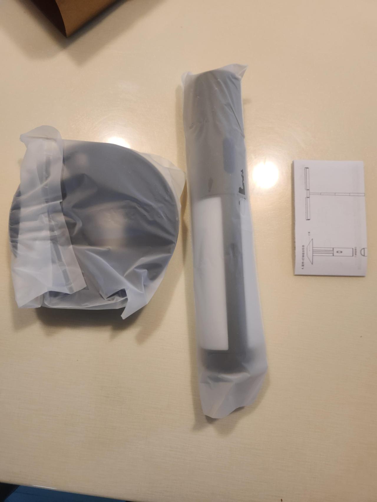 구성은 본체, 등갓, USB 케이블, 설명서. 각각 비닐 포장되어 있어