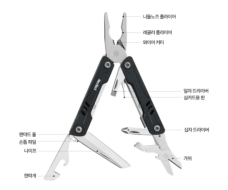 - 나이프, 드라이버, 줄, 캔따개 등 총 12가지 기능 탑재